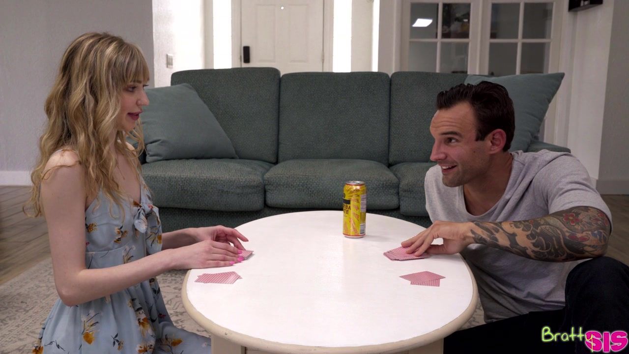 Давно мечтающая о члене сводного брата, милая девушка худышка специально проиграла ему секс в карты, и быстро сняв платье, приступила к минету, после которого он порадовал её глубоким трахом в киску.