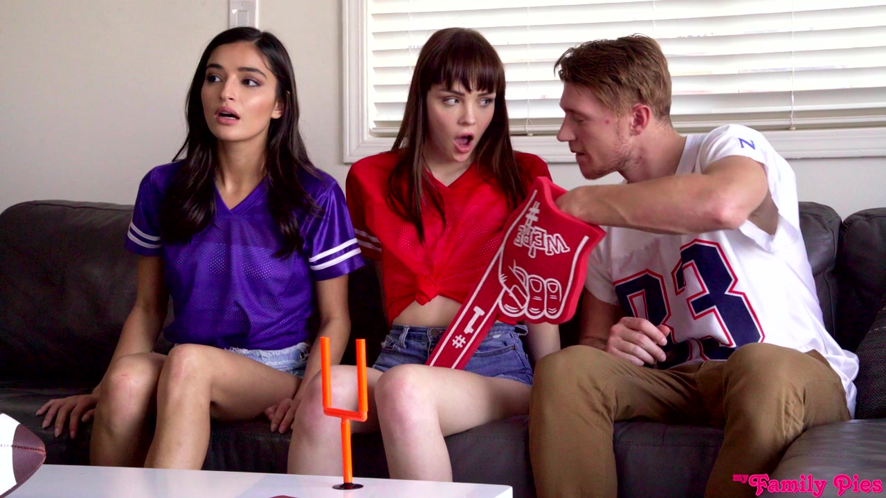 За просмотром телевизора, юная брюнетка натыкается в попкорне на твердый член, что становится началом страстного жмж секса с двумя горячими телками в кедах, которые ублажают член и киски друг друга.